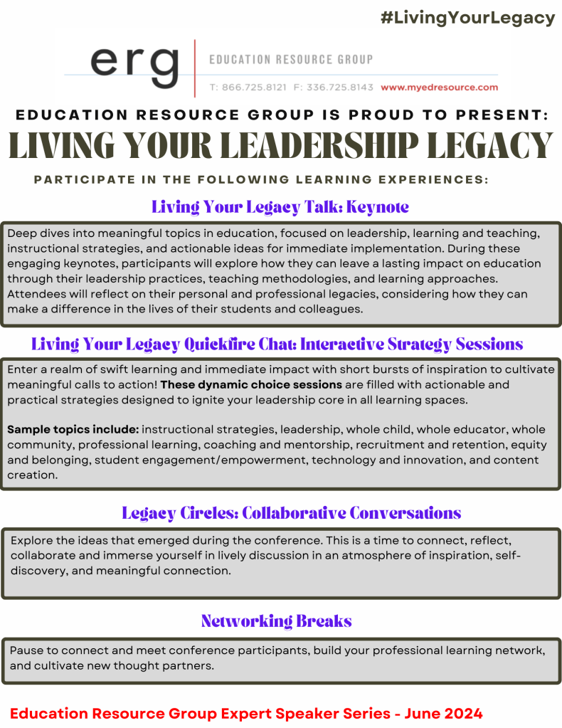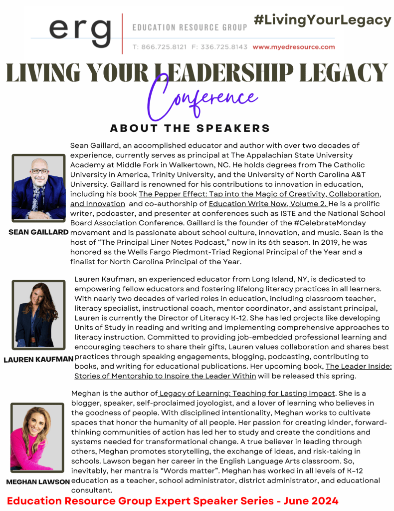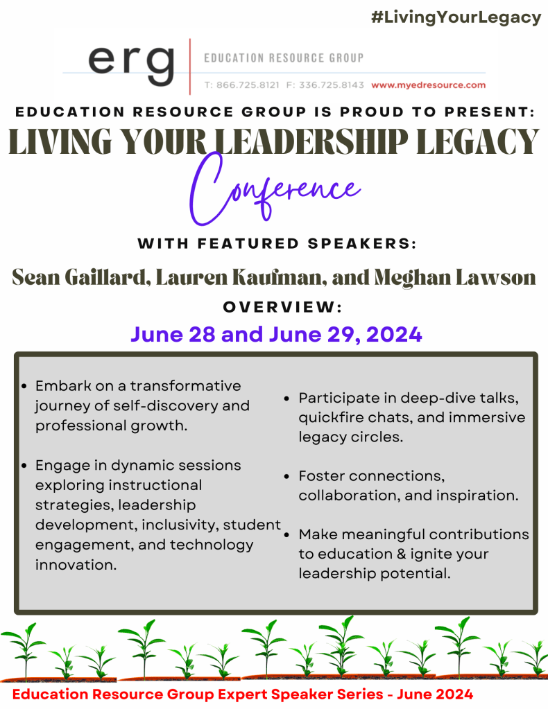 | In collaboration with ERG (Education Resource Group), Sean Gaillard, Lauren Kaufman, and Meghan Lawson invite you to join the Living a Leadership Legacy Conference where we will explore the themes of empowerment, collaboration, nurturing potential and much more. Join us as we delve into strategies for leaving a meaningful impact and igniting the leadership legacy of others. See more details below! REGISTER HERE |